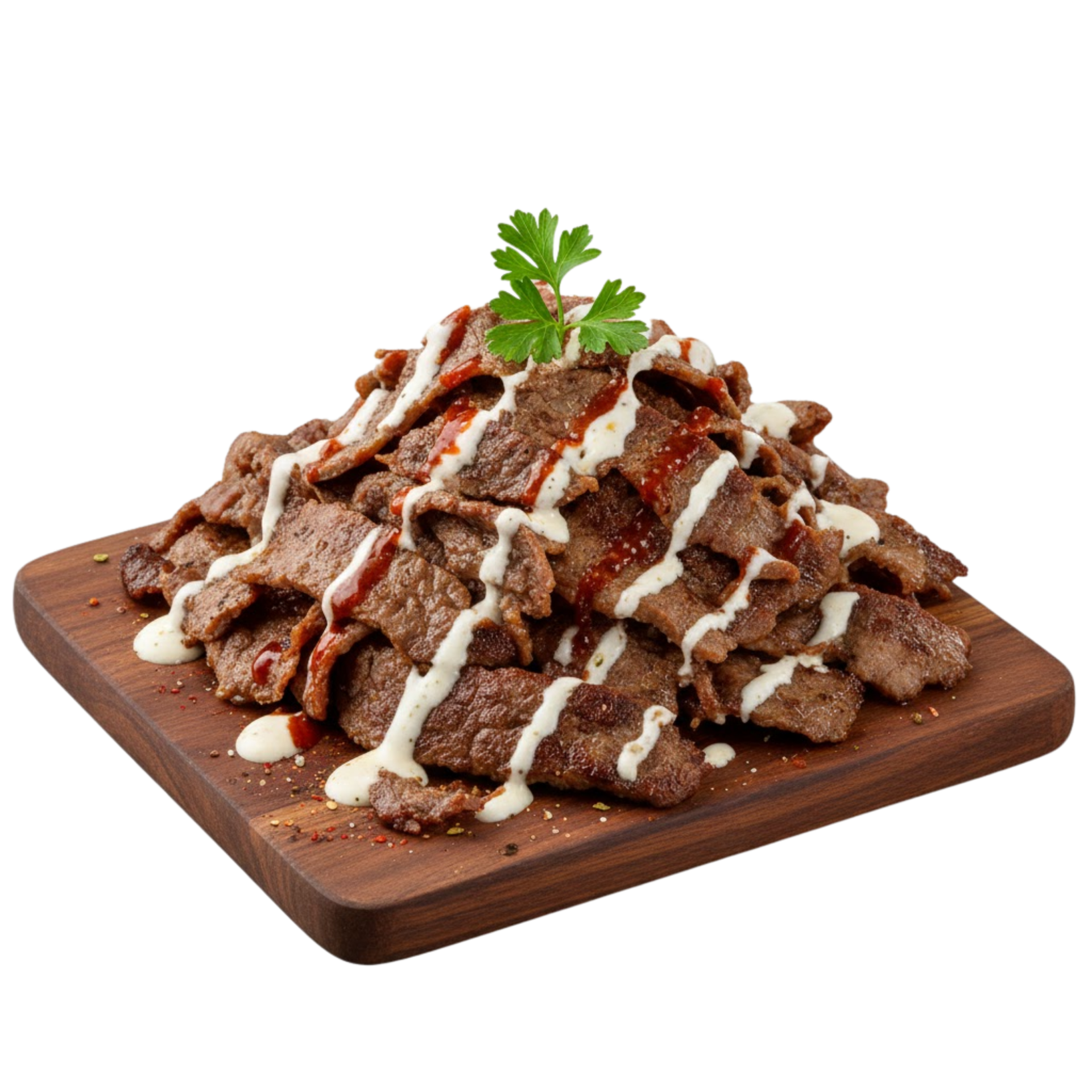 Shawarma beef burger with tomato, onions, pickles, cilantro & house sauce.
